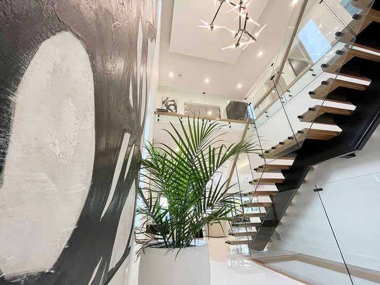 Stepping inside, the home reveals a carefully curated blend of materials. A bleached staircase and matching wide plank floors form the foundation of the interior, grounding it in natural textures and muted tones. Paired with modern light fixtures, a European-style fireplace, and a flat-paneled German-engineered kitchen, the aesthetic strikes a graceful balance between classic tradition and modern sophistication.